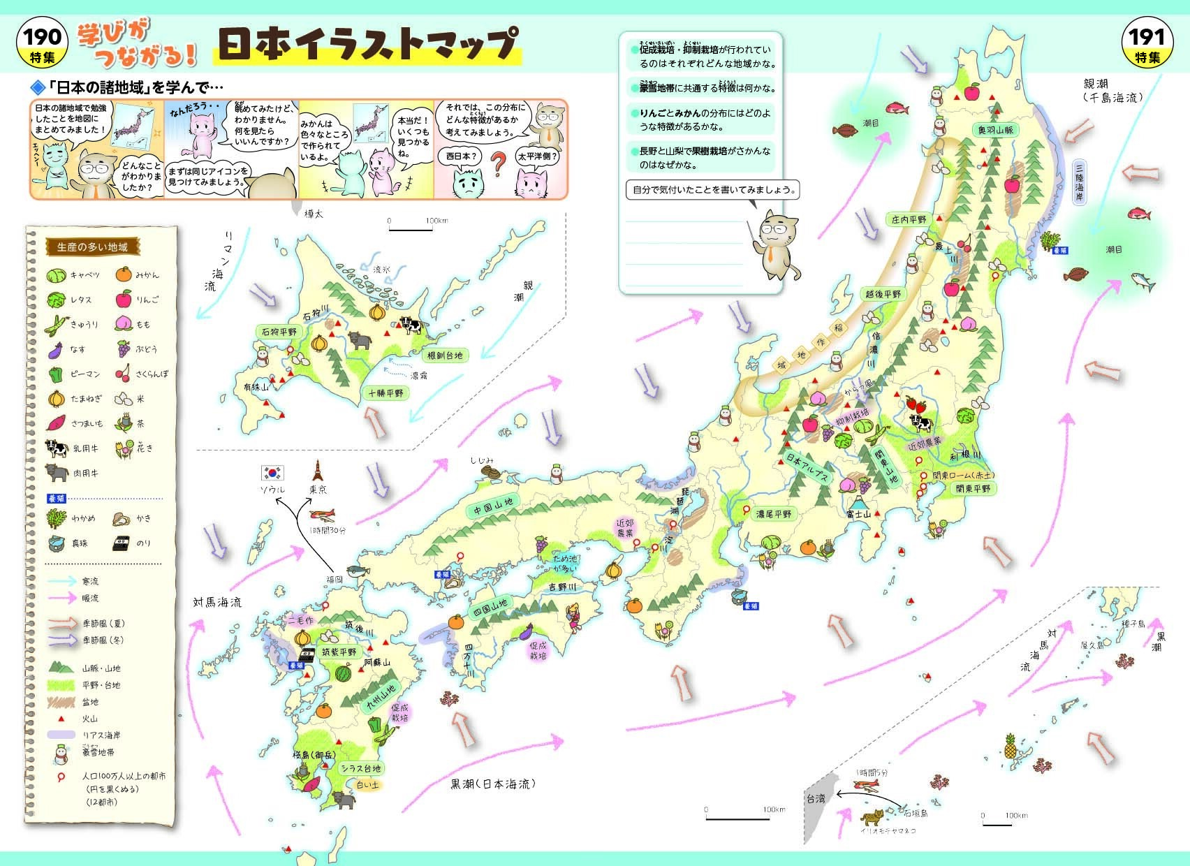- 地図を読みとく発問・ノート欄で,学びが深まります。