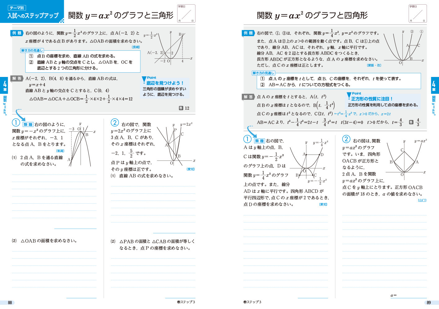 - 3年…テーマ別 【入試へのステップアップ】 例題 + 類題 で頻出テーマを重点的に練習できます。
