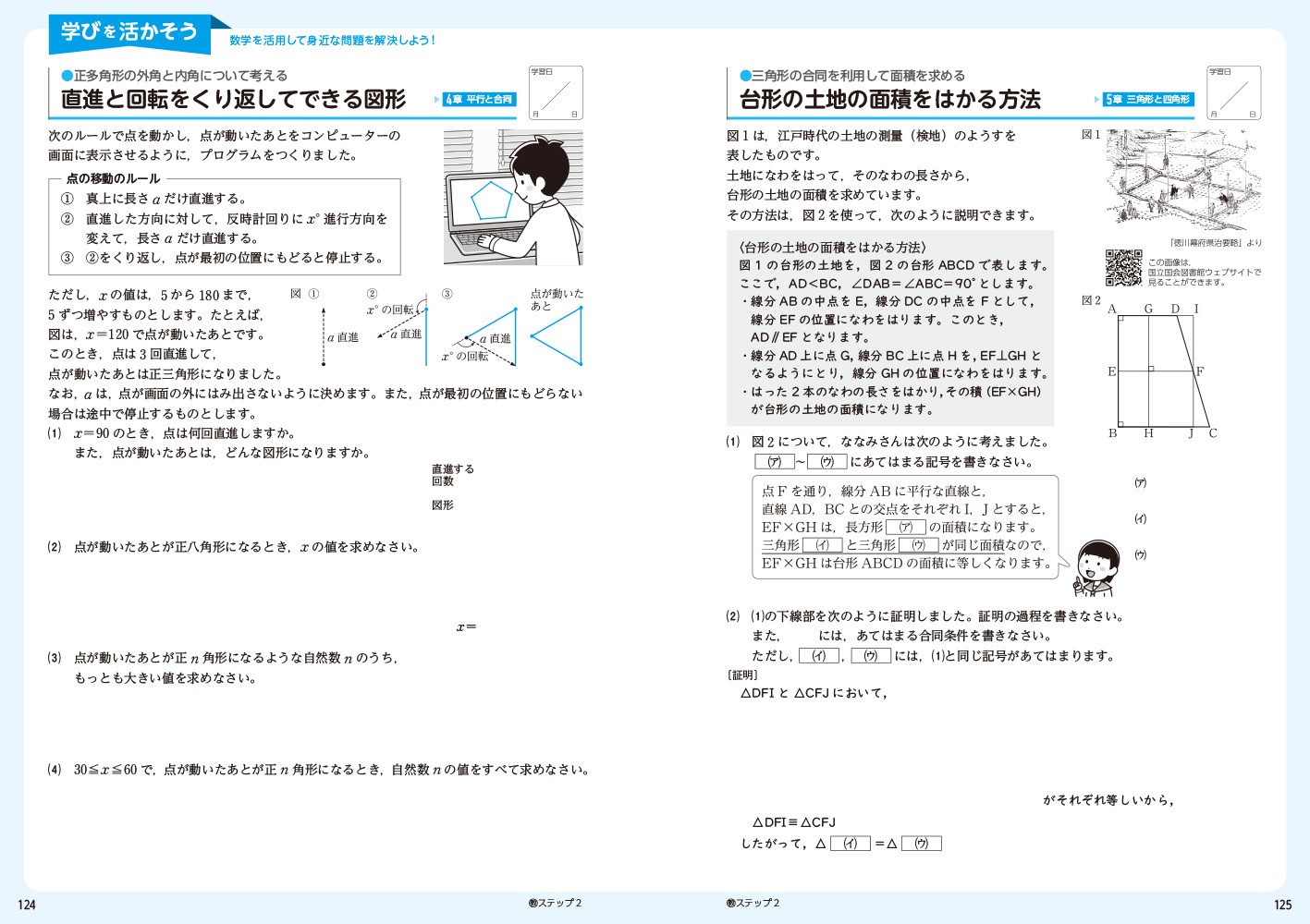 - 数と式、関数、図形の領域ごとに、身近な題材について数学を活用して考え解決する問題が入っています。