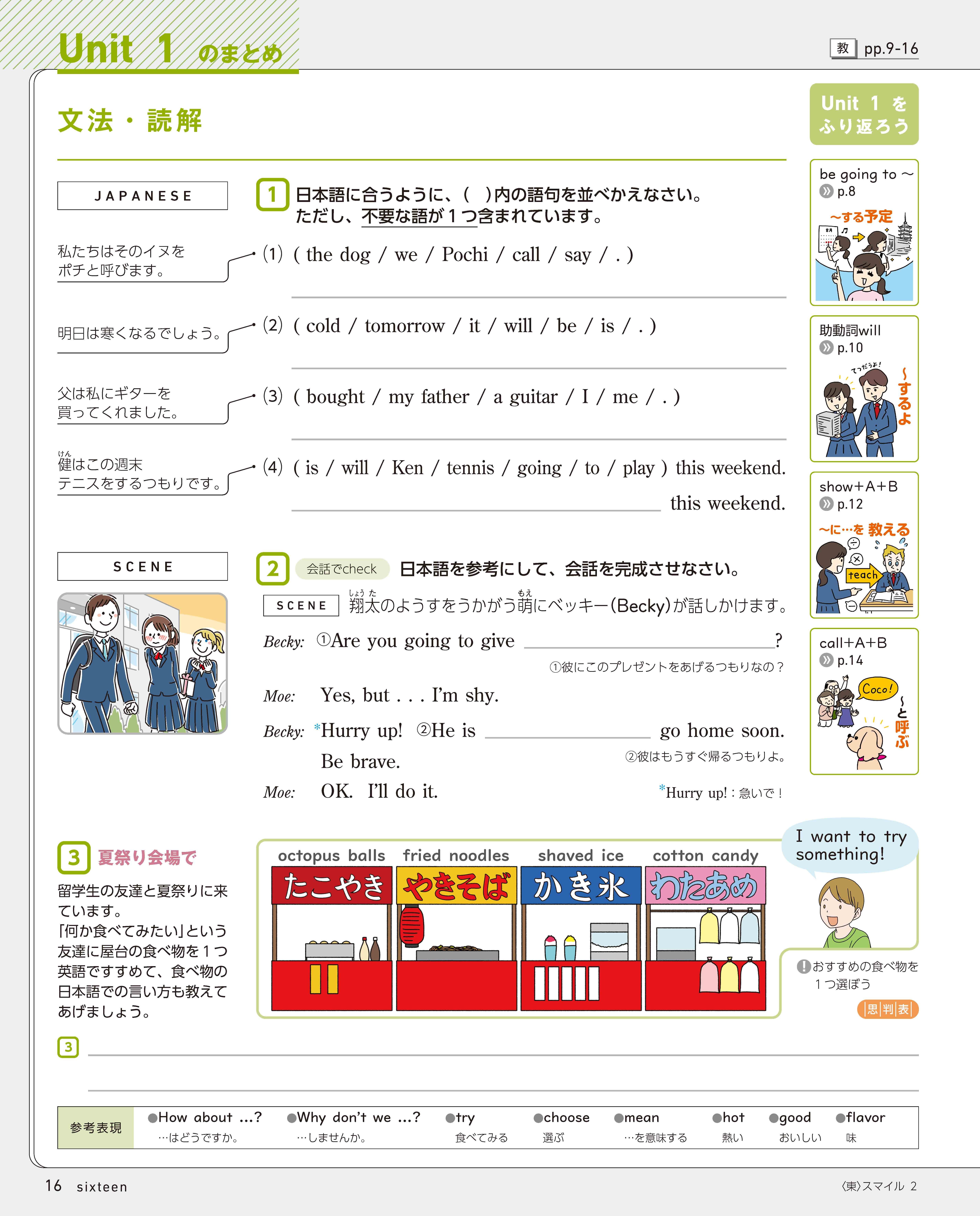 - 「つまずき解消!文法チェック」には、英文の誤りを見つけて正しく書き直す「まちがい探偵」コーナーがあります。