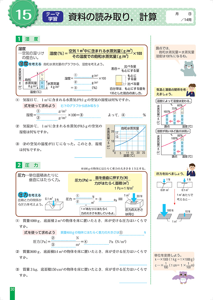 - 計算(圧力・オームの法則・電流のはたらき),資料(化学変化と物質の質量・湿度)