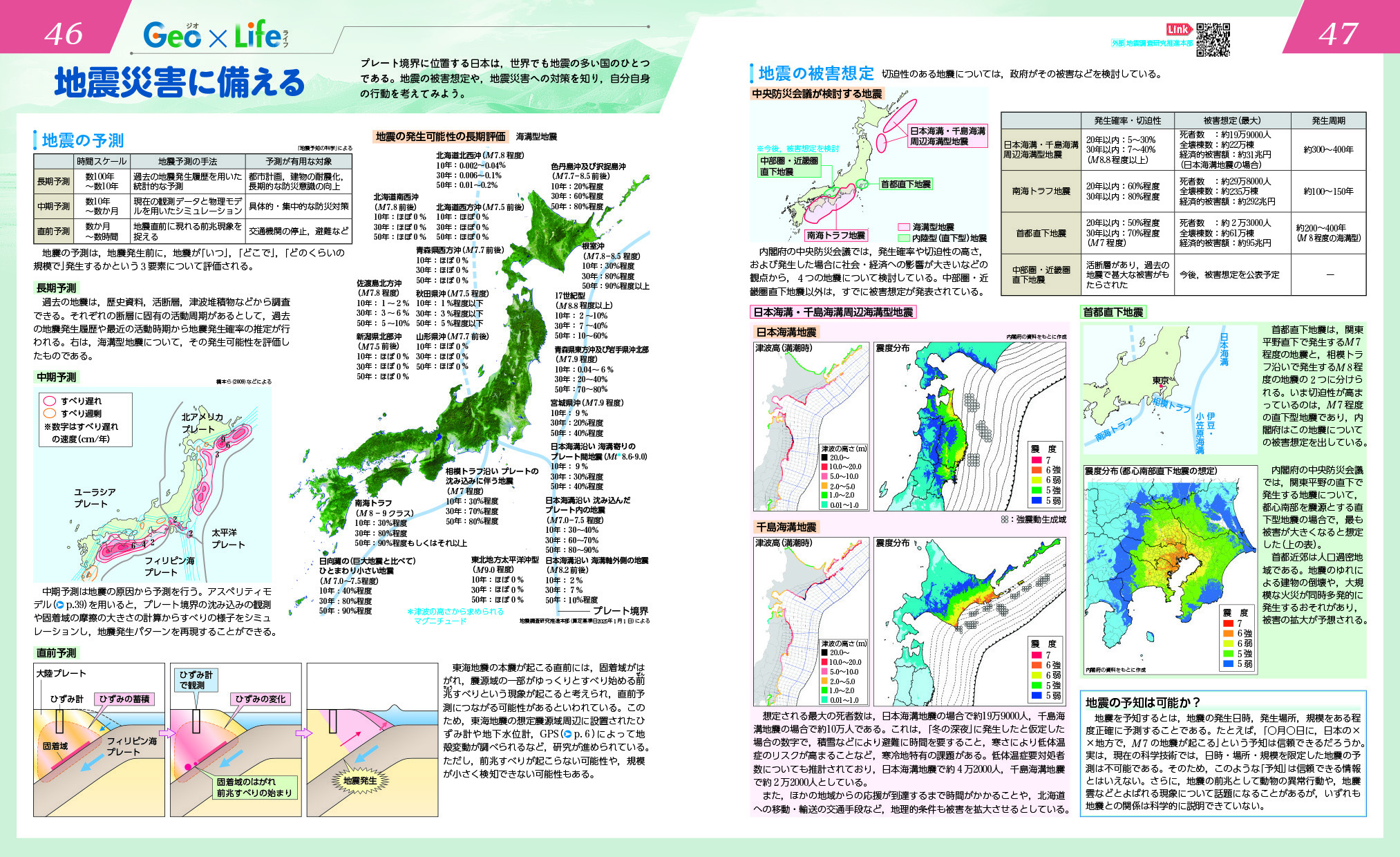 - 「地震災害に備える」(p.46-49)/「SDGsと地学」(p.222-223)など,地学と人の関わりがテーマのページです。