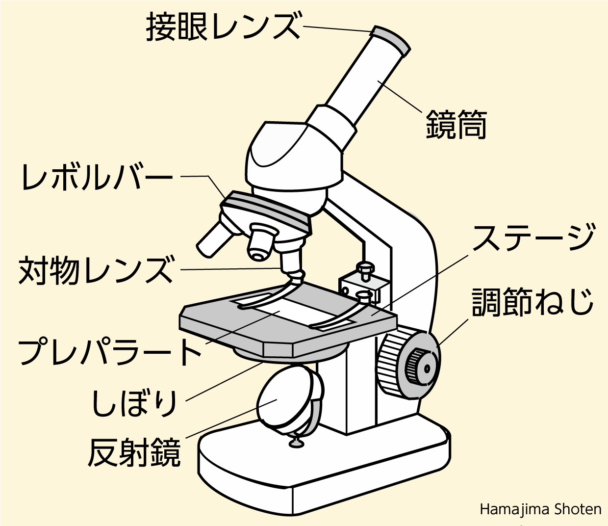 ウ.接眼レンズをのぞきながら調節ねじをまわして、プレパラートと対物レンズを離し、ピントを合わせる。