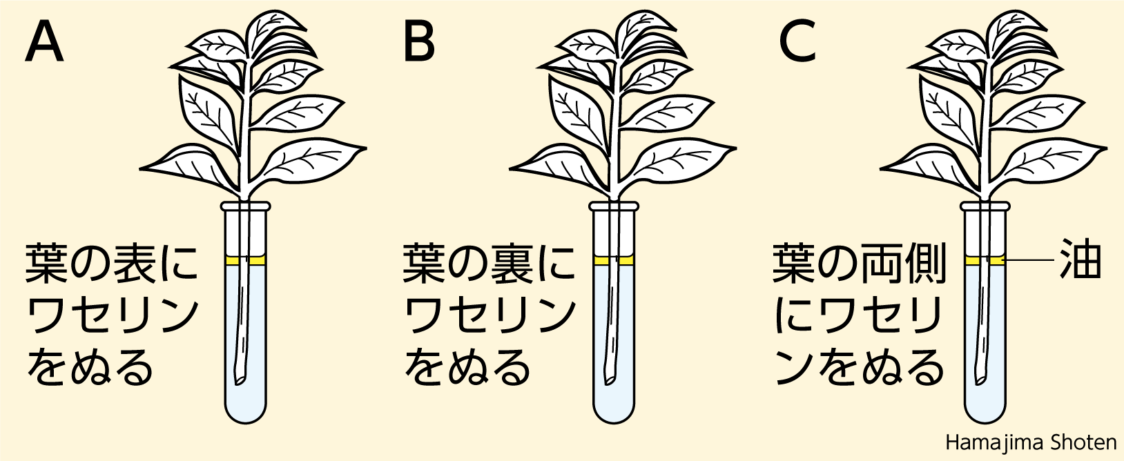 蒸散量について調べるため、葉の枚数や大きさがほぼ同じ枝を3本用意し、図のような処理を行って水にさした。