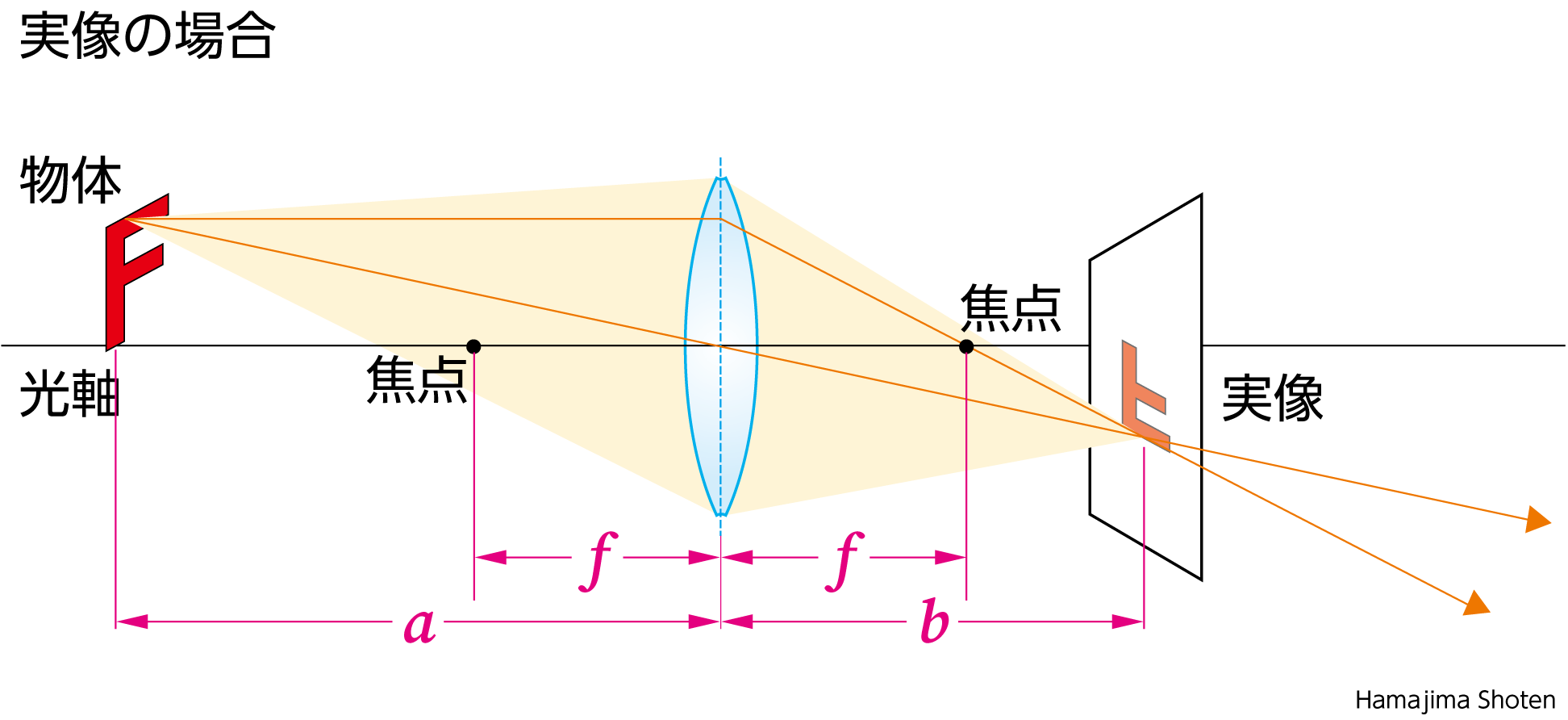 凸レンズの焦点距離をf、凸レンズと物体の距離をa、凸レンズと実像の距離をbとすると、これらの間には次の関係が成り立ちます。