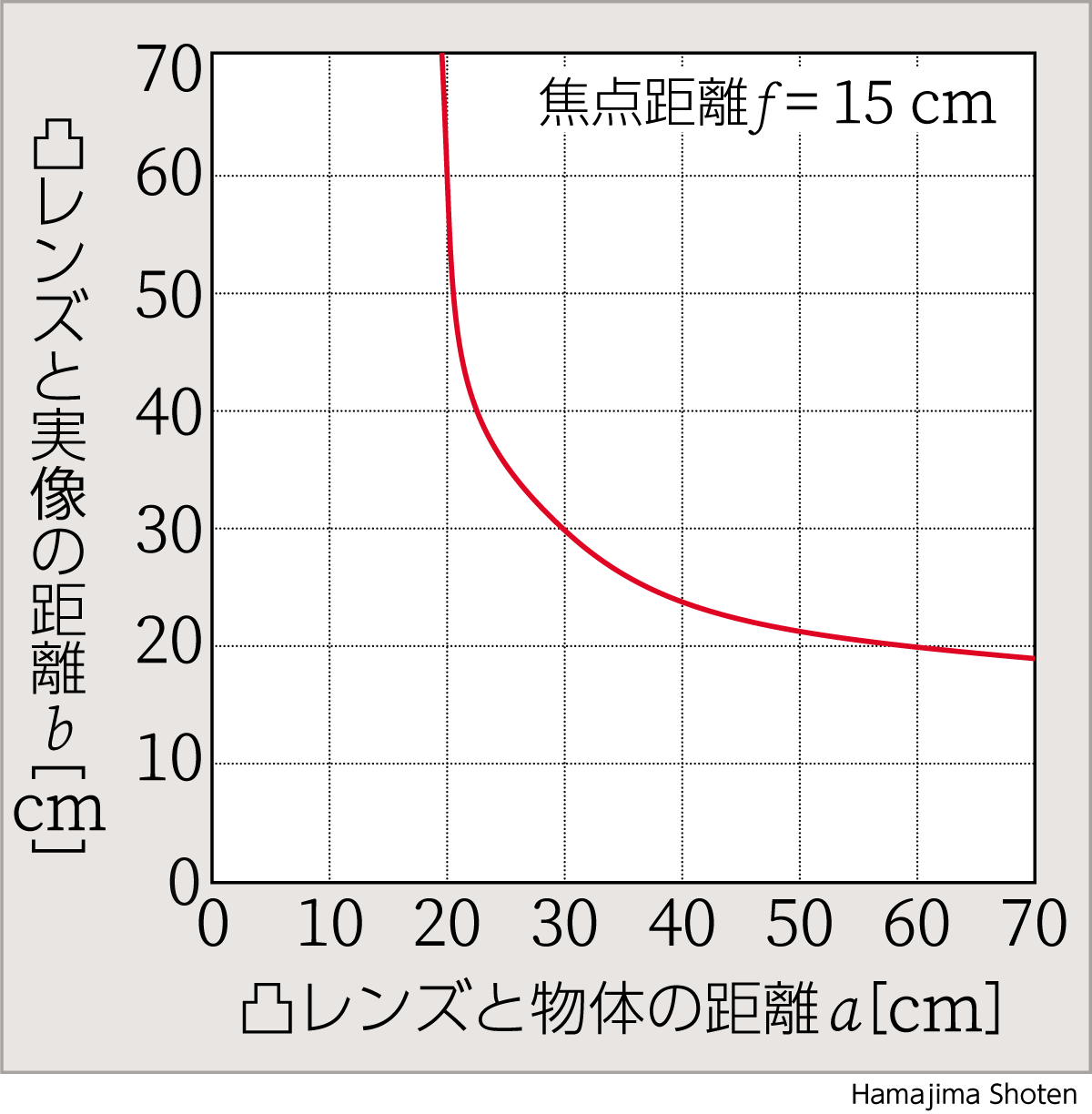 この関係を用いて、焦点距離fが15\,\mathrm{cm}のときの、凸レンズと物体の距離aと、凸レンズと実像の距離bの関係をグラフに表すと、次のようになります。