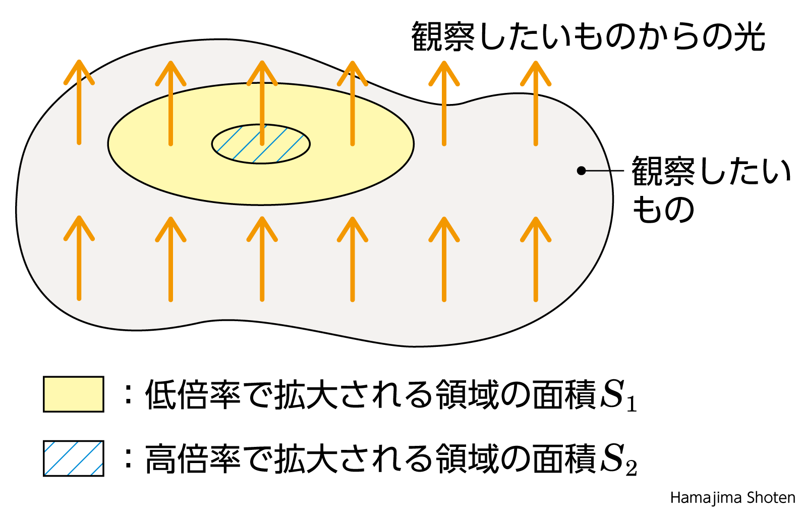 低倍率・高倍率にかかわりなく、Lの値は同じです。しかし、高倍率ではよりせまい範囲が拡大されたものを見るので、S_1>S_2となります。よって、①、②から、次の結論が得られます。