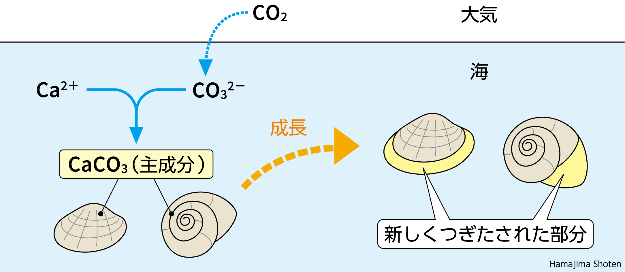 なお、貝殻の主成分は、二酸化炭素の発生の実験で使われる石灰石と同じ炭酸カルシウム\mathsf{CaCO_3}です。海にすむ貝のなかまの場合、炭酸カルシウムは海水中のカルシウムイオン\mathsf{Ca^{2+}}と、大気中の二酸化炭素\mathsf{CO_2}が海水にとけてできる炭酸イオン\mathsf{CO_3^{2-}}からつくられます。