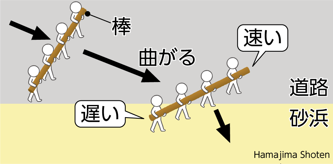 棒をもって行進する人々が、舗装された道路から砂浜に斜めに進むとき、砂浜では道路よりも歩く速さが遅くなります。歩く速さがちがうため、砂浜と道路の境界で進行方向は曲がります。