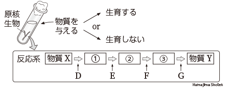 - ある原核生物では,物質Xから始まる反応系が進み,物質Yが合成されると生育できる・できない 。