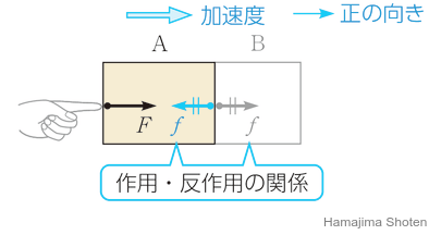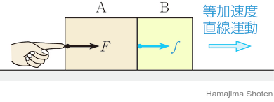 次の図のように,手で$\mathrm{A}$を水平右向きに大きさ$F$の力で押すと,$\mathrm{A}$と$\mathrm{B}$は接したまま右向きに等加速度直線運動をした。