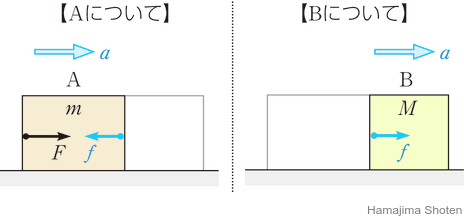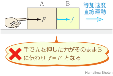 このときに$\mathrm{A}$が$\mathrm{B}$を押す力の大きさを$f$とすると,$f$と$F$の大小関係は,次のア~ウのうちのどれか。