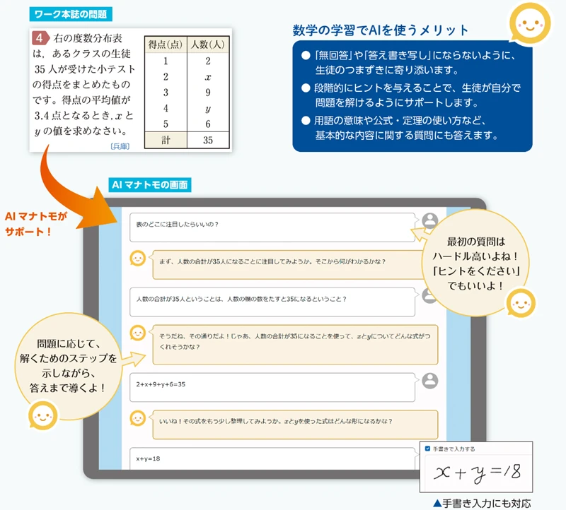 AIマナトモはワークの一部の問題に対応しています。ワークの中でも比較的難しい問題(特集ページ「入試問題で実力アップ!」の数と式・関数・データの活用領域の問題)の学習をサポートします。