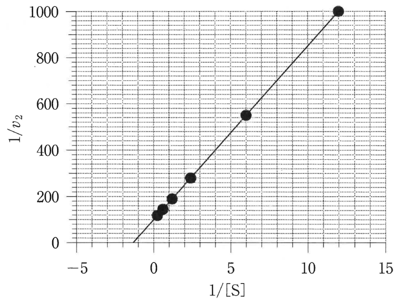 問5 基質濃度を \mathsf{[S]},反応速度を v_2,最大反応速度を V_\mathrm{max} とすると,式⑧の逆数および式⑨から,以下の式⑩が成り立つ。 \frac{1}{v_2}=\frac{K_\mathrm{m}}{V_\mathrm{max}\mathsf{[S]}}+\frac{1}{V_\mathrm{max}}\qquad \cdots\cdots\text{⑩} 式⑩と表2の逆数を用いて,縦軸を 1/v_2,横軸を 1/\mathsf{[S]} としてプロットを直線で結ぶと図1の二重逆数プロットが得られた。図1から,V_\mathrm{max} と K_\mathrm{m} を求めよ。