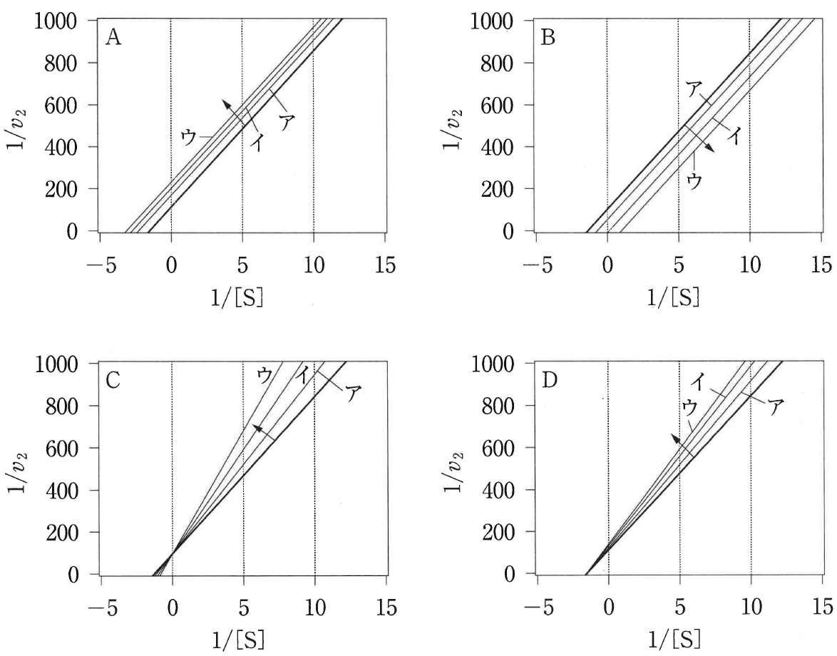 阻害剤の濃度をア,イ,ウの順番で上げていくと,図1で記した直線はどのように変わるか。図2のA〜Dの中から正しいものを一つ選べ。また,正しい理由を説明せよ。