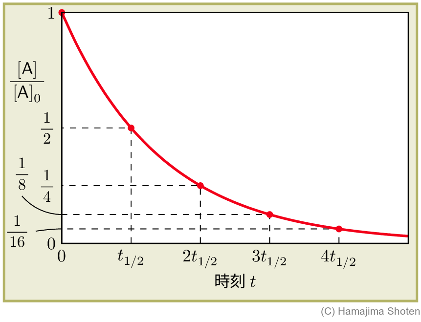 この反応の半減期を t_{1/2} とすると,式 (6) により, \begin{align} t=t_{1/2}\text{のとき, }e^{-kt_{1/2}}=\frac{\mathsf{[A]}}{\mathsf{[A]}_0}=\frac{1}{2} \end{align} である。また, \begin{align*} t=2t_{1/2}\text{のとき, }&\frac{\mathsf{[A]}}{\mathsf{[A]}_0}=e^{-k\cdot 2t_{1/2}}=\left(e^{-kt_{1/2}}\right)^2=\left(\frac{1}{2}\right)^2=\frac{1}{4}\\ t=3t_{1/2}\text{のとき, }&\frac{\mathsf{[A]}}{\mathsf{[A]}_0}=e^{-k\cdot 3t_{1/2}}=\left(e^{-kt_{1/2}}\right)^3=\left(\frac{1}{2}\right)^3=\frac{1}{8}\\ t=4t_{1/2}\text{のとき, }&\frac{\mathsf{[A]}}{\mathsf{[A]}_0}=e^{-k\cdot 4t_{1/2}}=\left(e^{-kt_{1/2}}\right)^4=\left(\frac{1}{2}\right)^4=\frac{1}{16}\\ \cdots\cdots \end{align*} となり,時刻が半減期 t_{1/2} の2倍,3倍,4倍,…となると,\dfrac{\mathsf{[A]}}{\mathsf{[A]}_0} は \dfrac{1}{4},\dfrac{1}{8},\dfrac{1}{16},…となることがわかる。