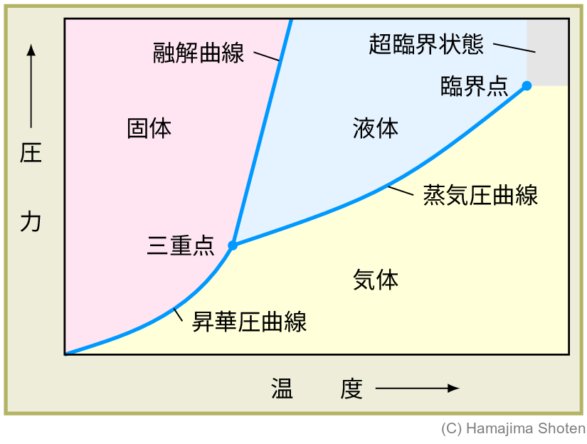 固体と気体の境界線は昇華圧曲線,固体と液体の境界線は融解曲線,液体と気体の境界線は蒸気圧曲線になる。これらの境界線が交わる点(三重点)は,固体・液体・気体が共存する点である。