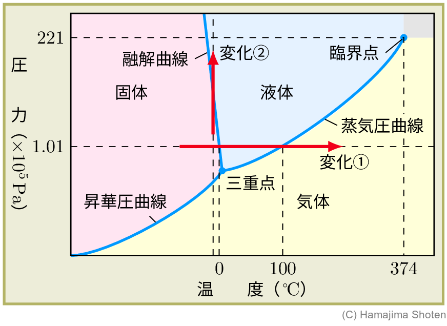 水は,三重点以下の温度で液体が存在する。そのため,水の融解曲線は,傾きが負になっていて,一定の温度で圧力を高くすると,固体が液体に変化することがわかる(変化②)。