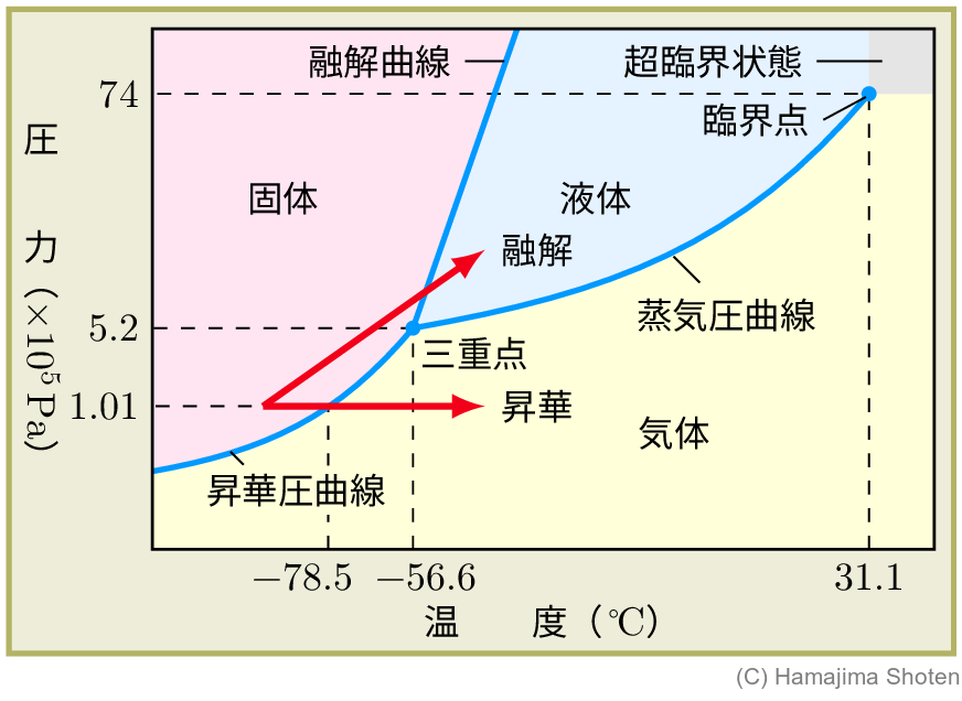 1気圧( 1.01\times 10^5\,\mathrm{Pa} )では,二酸化炭素の固体(ドライアイス)は昇華して気体になる。ドライアイスを液体にするには,大きな圧力を加えなくてはならない。