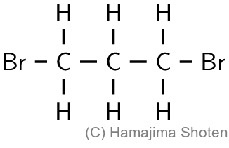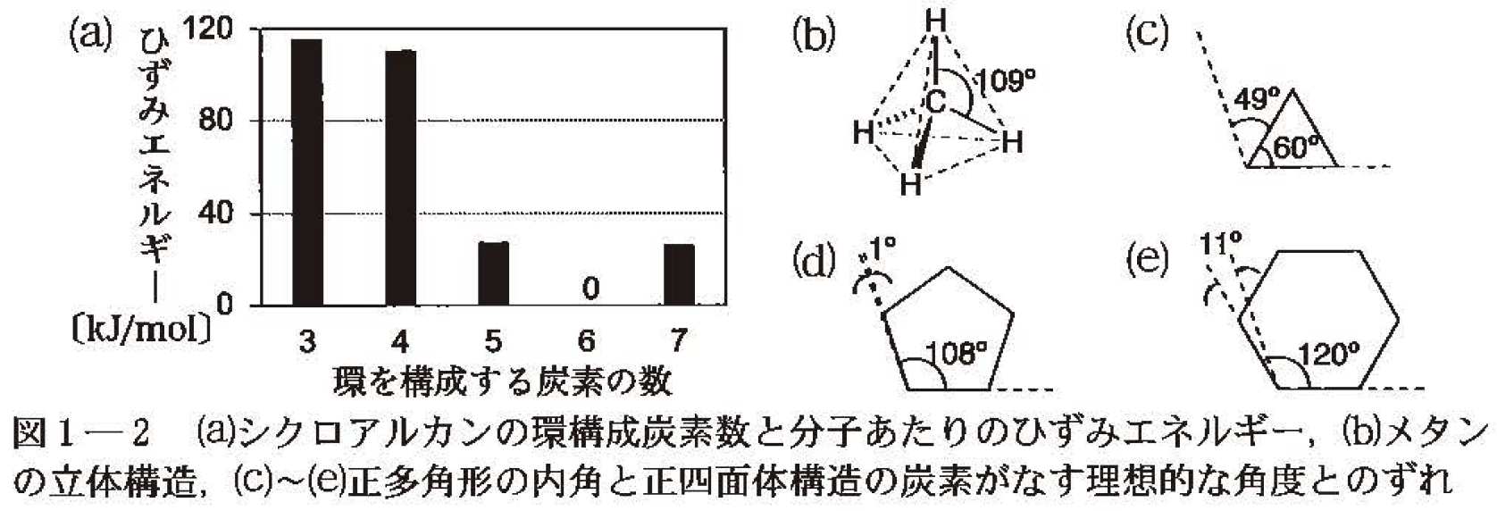 三員環から七員環のシクロアルカンのひずみエネルギーを図1-2⒜に示す。メタン分子の \mathsf{H-C-H} のなす角は約 109^\circ である(図1-2⒝)。シクロプロパンの \mathsf{C-C-C} がなす角は 109^\circ より著しく小さく(図1-2⒞),ひずみエネルギーが大きい。そのため,①シクロプロパンは臭素と容易に反応し,化合物 I を生じる。