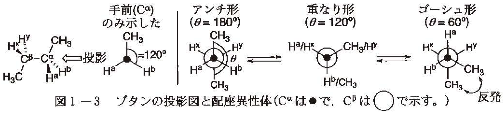 分子の立体構造を考える上で,図1-3に示す投影図が有用である。ブタンを例にすると,\mathsf{C}^\alpha と \mathsf{C}^\beta の結合軸に沿って見たとき,投影した炭素と水素がなす角はおよそ 120^\circ である。② \underline{\mathsf{C}^\alpha} と \underline{\mathsf{C}^\beta} の間の単結合が回転することで異性体の一種である配座異性体を生じる。ブタンのメチル基どうしがなす角 \theta が 180^\circ のときをアンチ形という。\mathsf{C}^\alpha と \mathsf{C}^\beta の結合をアンチ形から 60^\circ 回転すると置換基が重なった不安定な重なり形の配座異性体となる。さらに 60^\circ 回転した配座異性体をゴーシュ形という。ゴーシュ形はメチル基どうしの反発により,アンチ形より約 4\,\mathrm{kJ/mol} 不安定である。