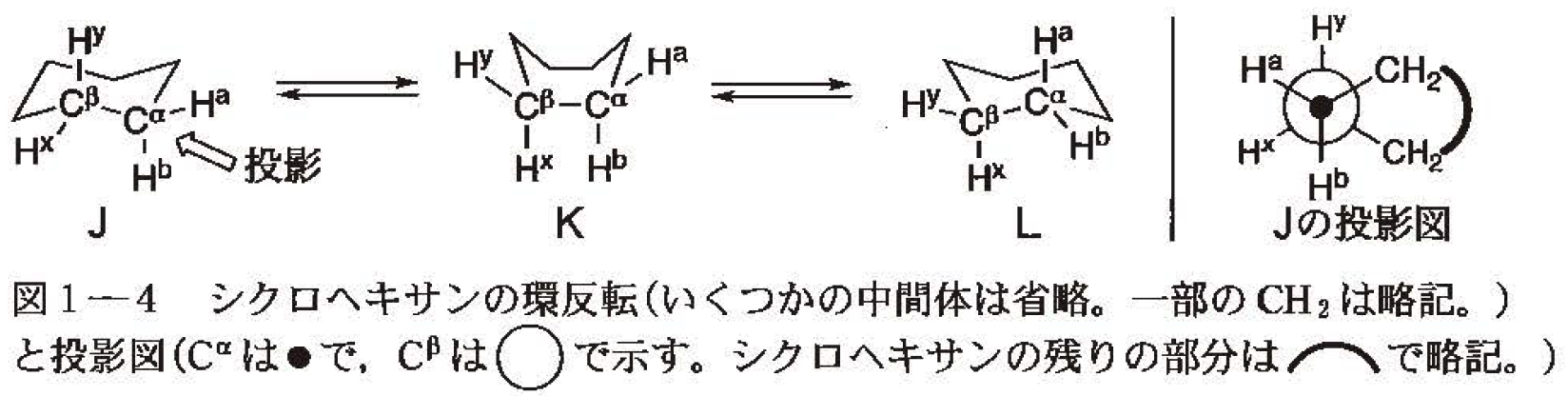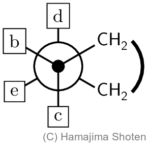 シクロヘキサンのいす形の配座異性体J(図1-4)の各 \mathsf{C-C} 結合の投影図を考えると,すべてにおいて \mathsf{CH_2} どうしが( a )となる。また,\mathsf{C-C-C} がなす角が 109^\circ に近づくため,ひずみエネルギーをもたない。Jには環の上下に出た水素( \mathsf{H}^\mathrm{b},\mathsf{H}^\mathrm{y} )と環の外側を向いた水素( \mathsf{H}^\mathrm{a},\mathsf{H}^\mathrm{x} )がある。不安定なKを経て配座異性体Lへと異性化することで,水素の向きが入れ替わる。