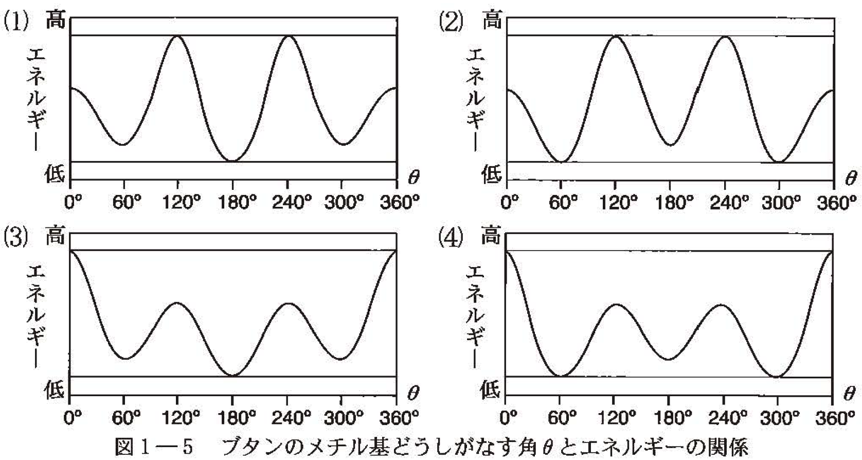 イ 下線部②について,ブタンの配座異性体のエネルギーと角 \theta との関係の模式図として相応しいものを図1-5の⑴〜⑷の中から1つ選べ。なお,メチル基どうしの反発に比べ水素と水素,水素とメチル基の反発は小さい。