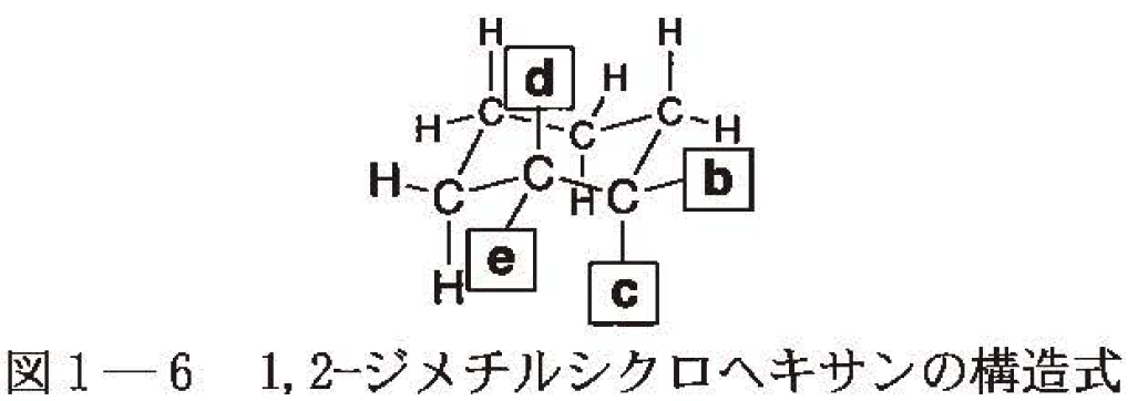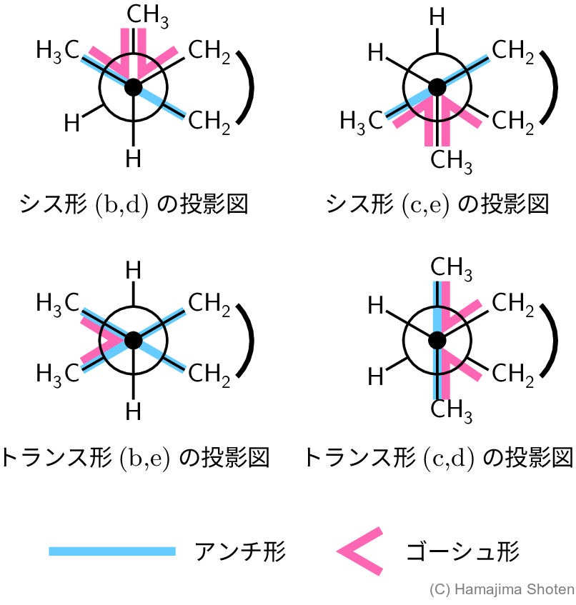 2つのメチル基は,(b,d),(b,e),(c,d),(c,e)の4通りの結合が考えられ,(b,d)と(c,e)がシス形,(b,e)と(c,d)がトランス形の立体異性体になる。それぞれの投影図をつくると,図Cのようになる。