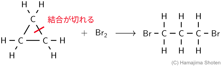 シクロプロパンはひずみエネルギーが大きいため,\mathsf{C-C} 結合が切れて,\mathsf{Br_2} や \mathsf{H_2} と反応し,より安定な状態になる。