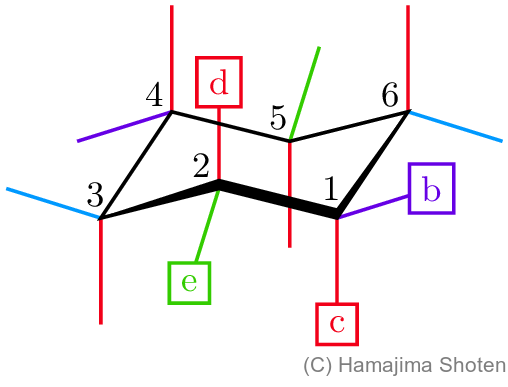 トランス形(b,e)には,アンチ形が2か所,ゴーシュ形が1か所が含まれ,トランス形(c,d)には,アンチ形が1か所,ゴーシュ形が2か所含まれる。よって,ゴーシュ形が少ない(b,e)の方がエネルギーが低く安定している。