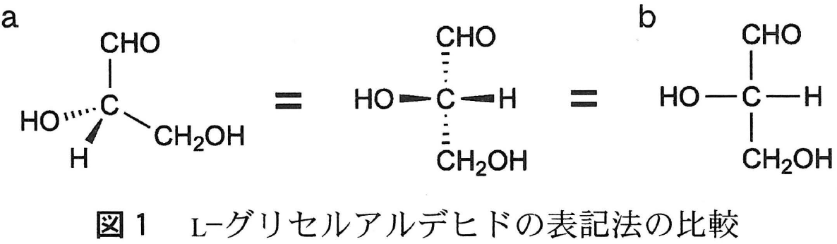 L-グリセルアルデヒドは分子内に不斉炭素原子をひとつ含む炭素数3の単糖である。その立体配置は図1aのように示すことができ,太線()は紙面の手前側へ出ている結合,破線(