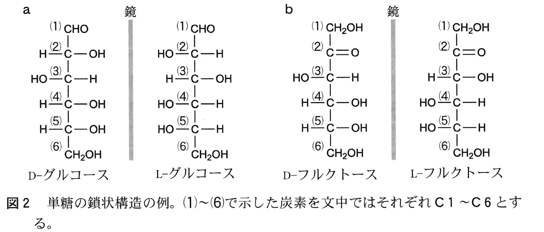 天然の単糖であるD-グルコースの鎖状構造を,フィッシャー投影式を用いて,鏡像異性体であるL-グルコースの鎖状構造とともに図2aに示した。両者を比較すると,分子内の4箇所すべての不斉炭素原子に結合した原子の配置は,鏡像の関係にある。D-フルクトース(天然型)とその鏡像異性体(L-フルクトース)についても,フィッシャー投影式を図2bに示した。