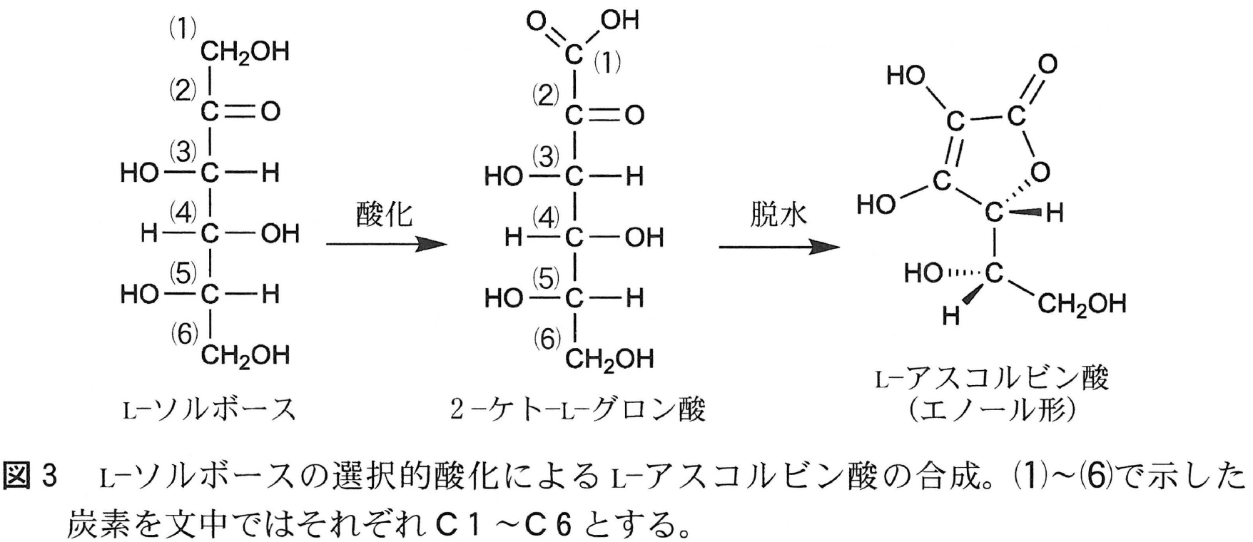 L-アスコルビン酸(ビタミンC)はL-ソルボースから図3に示した経路で合成される。まず,②L-ソルボースの \underline{\mathsf{C1}} 炭素を含む \underline{\mathsf{CH_2OH}} 基を選択的にカルボキシ基まで酸化することで,2-ケト-L-グロン酸が合成される。続いて,③脱水縮合反応によって分子内エステル結合が形成され,ケト形のL-アスコルビン酸が得られる。この化合物はエノール形のL-アスコルビン酸へ変化する。
