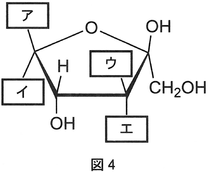 問1 下線部①のL-ソルボースの五員環構造を図4に示した。\fbox{\text{ ア }} 〜 \fbox{\text{ エ }} にあてはまる原子または原子団を化学式で答えよ。