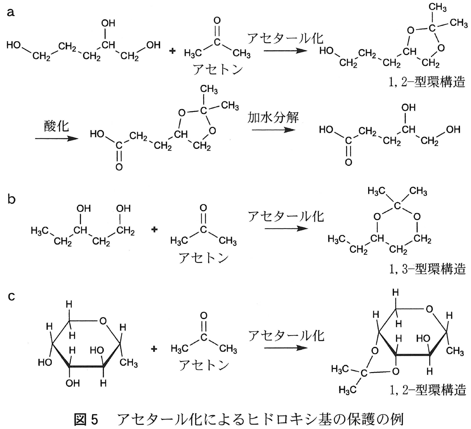 複数のヒドロキシ基をもつ化合物において,特定のヒドロキシ基のみを反応させる方法のひとつに,反応させたくないヒドロキシ基を一時的に異なる化学構造に変換し,望まない反応を防ぐという手法がある。このような手法は「保護」と呼ばれ,その概念を図5aに示した。空間的に近接した2つのヒドロキシ基を,アセトンと反応(アセタール化)させることで,五員環構造にしている。この環構造は,1,2-型環構造と呼ばれ,酸化反応の影響を受けない。一方で,酸性条件下では加水分解により開裂し,もとのヒドロキシ基に戻る。図5bのような配置のヒドロキシ基の間でもアセタール化は進行し,六員環構造(1,3-型環構造)を与える。また,分子内に3つ以上のヒドロキシ基が含まれる場合(図5aや5c)は,より近接した2つのヒドロキシ基の間でアセタール化がおこる。