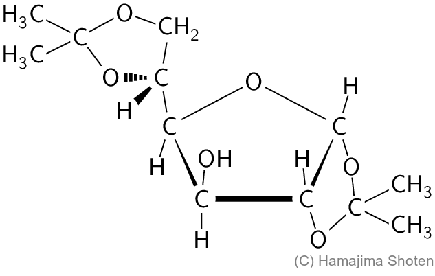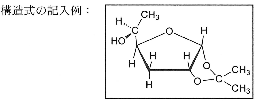(ⅱ) 単糖類の化学反応に興味を持った大学生のAさんは,D-グルコースをアセトンと反応させ,得られた化合物の構造を解析した。その結果,D-グルコースは,水溶液中の存在比が非常に小さい五員環構造をとってアセトンと反応したことがわかった。また,その反応により得られた化合物には2つの1,2-型環構造が含まれることが判明した。Aさんが得た化合物の構造を,下記の記入例にならって示せ。不斉炭素がある場合は,その立体構造がわかるようにすること。