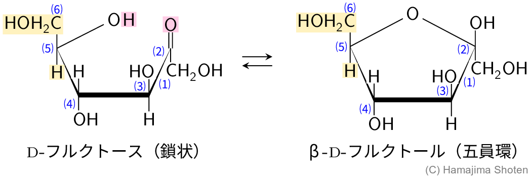 D-フルクトースは,図Aのように,鎖状構造と環状構造(五員環)が平衡状態になっている。なお,問題の図4から,\mathsf{C2} に結合するカルボキシ基が上側であるので,β-フルクトースとした。