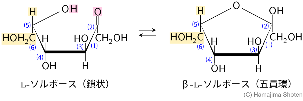 L-ソルボースはD-フルクトースの立体異性体の1つで,\mathsf{C5} 炭素に結合した原子または原子団の配置だけが異なっていることから,図Bのように,鎖状構造と環状構造(五員環)が平衡状態になっていると考えられる。\mathsf{C5} 炭素に結合する \mathsf{CH_2OH} と \mathsf{H} の配置が,D-フルクトースの逆になっていることに注意する。