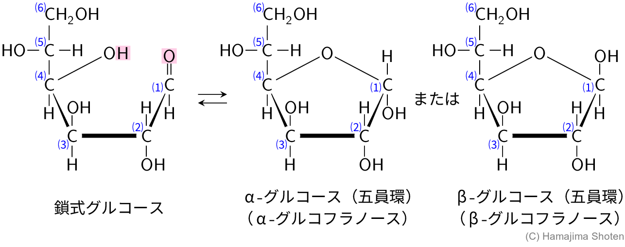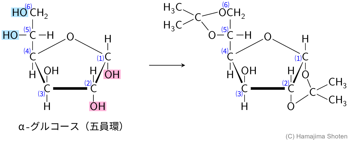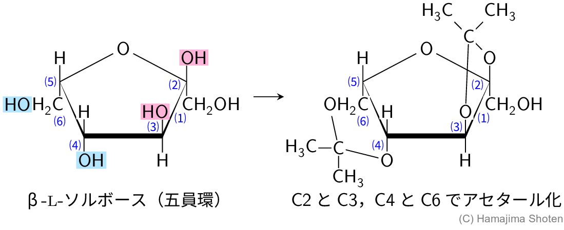 隣り合う炭素に結合したヒドロキシ基がアセタール化して1,2-型環構造,間に炭素原子が1つ入った2つの炭素原子に結合したヒドロキシ基がアセタール化して1,3-型環構造ができる。いずれの場合も,より近接したヒドロキシ基どうしでアセタール化が起こる。