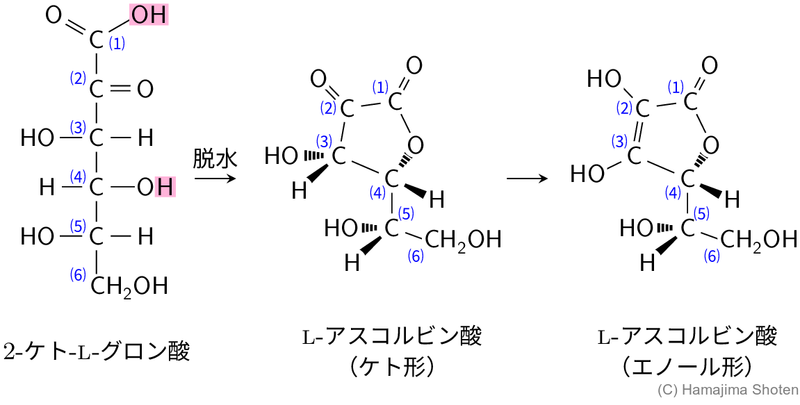 問題の図3で,2-ケト-L-グロン酸とL-アスコルビン酸(エノール形)の比較から,\mathsf{C1} のヒドロキシ基(カルボン酸の \mathsf{OH} )と \mathsf{C4} のヒドロキシ基(アルコールの \mathsf{H} )で脱水(エステル化)すると考えられる。