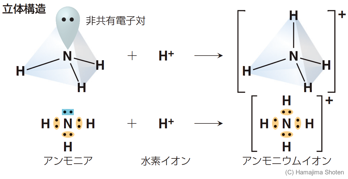 たとえば,アンモニア \mathsf{NH_3} に水素イオンが配位結合すると,アンモニウムイオン \mathsf{NH_4{}^+} ができる(図7)。