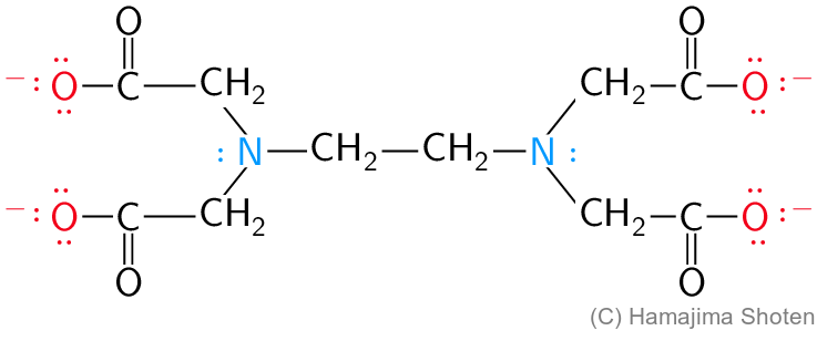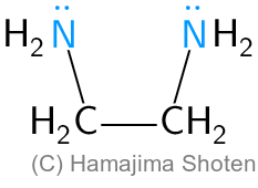 多座配位子には,たとえば二座配位子であるエチレンジアミン( \mathsf{en} と略記),六座配位子であるエチレンジアミン四酢酸イオン( \mathsf{EDTA^{4-}} と略記)などがある(図1,2)。