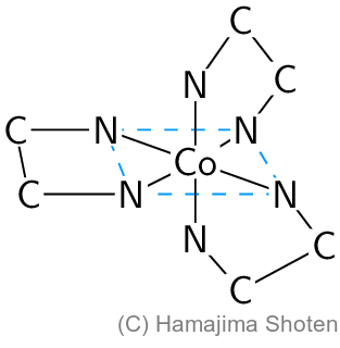 二座配位子であるエチレンジアミンが,コバルトイオン(Ⅲ) \mathsf{Co^{3+}} (配位数6,補足④ 配位数)に配位結合してできた錯イオン \mathsf{[Co(en)_3]^{3+}} (補足② 錯イオン)の構造は,図3のようになる。