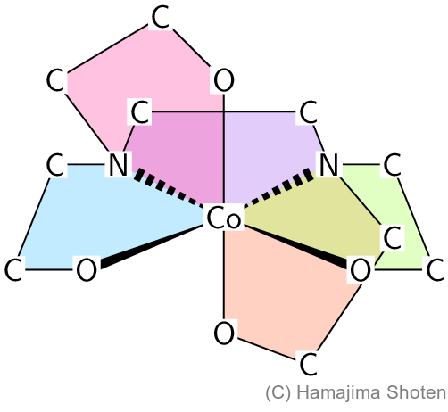 エチレンジアミン( \mathsf{en} )は,配位結合をする原子が2個含まれているので,\mathsf{en} 3個が配位数6の \mathsf{Co^{3+}} と配位結合して,正八面体の構造の錯イオンになる。このとき,\mathsf{Co^{3+}},配位子の2つの窒素原子 \mathsf{N},2つの炭素原子 \mathsf{C} で,五角形の環(五員環)が3個できる。