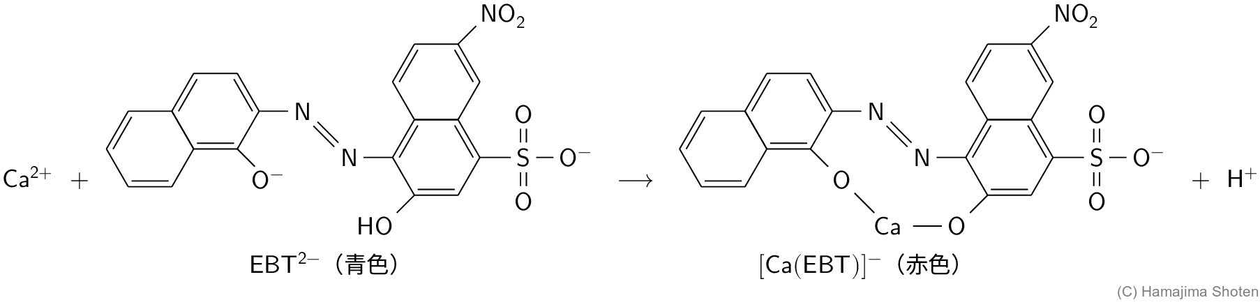\mathsf{[Ca(EBT)]^-\text{(赤色)}+\;EDTA^{4-}\;+\;H^+\;\longrightarrow \;[Ca(EDTA)]^{2-}\;+\;EBT^{2-}\text{(青色)}}