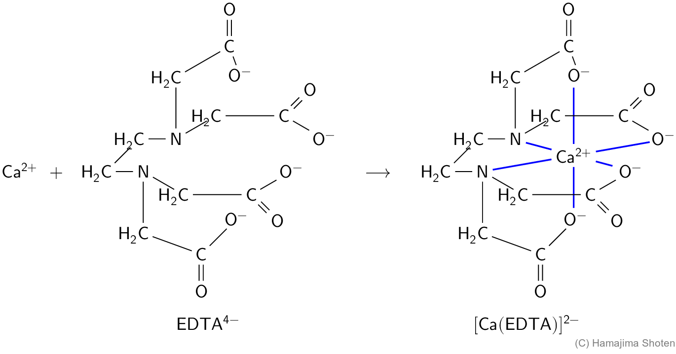 したがって,加えた \mathsf{EDTA^{4-}} の滴下量から,\mathsf{Ca^{2+}} 濃度を求めることができる。