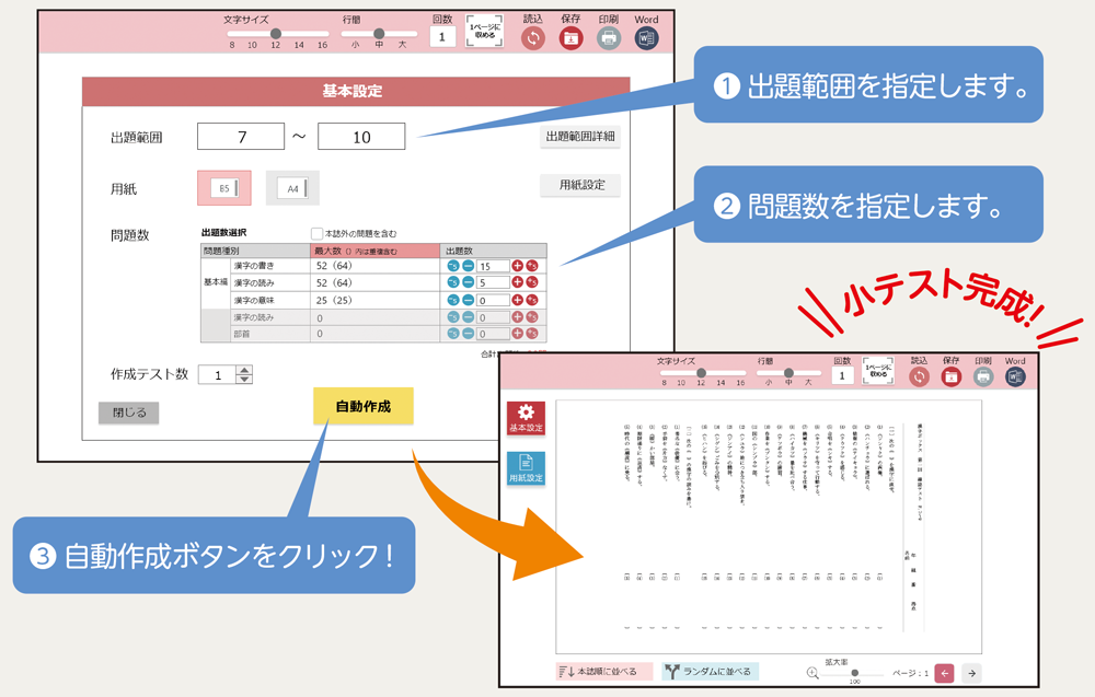 本Webページより,漢字テスト作成システムのデモ版をご利用いただくことができます。